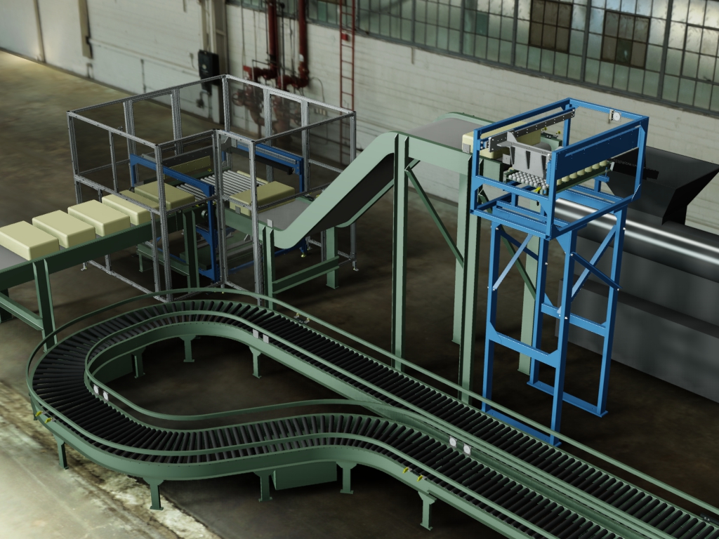 CHALLENGE: A manufacturer of medical gloves needed to transfer large bales of a very tacky rubber material from a queuing conveyor, through a right-angle turn, up an incline conveyor, and through another turn into the overhead feed funnel of a pelletizing extruder.The tacky nature of the material dictated that the bales could not touch one another during transport. Also, process constraints required the queuing conveyor to run at a very slow speed while the incline conveyor ran faster. |